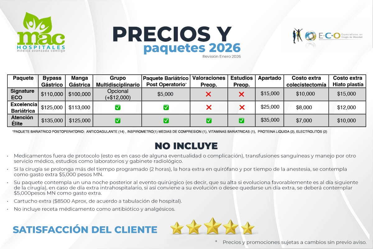 (INCLUYE 5 CONSULTAS DE NUTRICION, 5 CONSULTAS DE MEDICINA INTERNA, 5 CONSULTAS DE PSICOLOGIA,  Y 5 CONSULTAS DE CIRUGIA BARIATRICA)